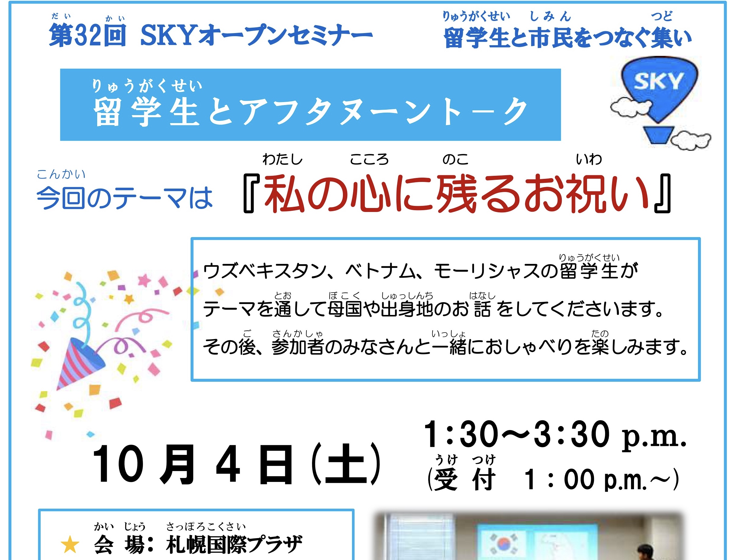 当会は公益財団法人札幌国際プラザ内に事務局を置き、国際プラザとの協力による派遣活動と外国語ボランティアネットワーク独自の自主活動を行うボランティアグループです。 What's New [報告] 第10回SKYオープンセミナー地域版 (2025. 11. 29) [報告] 留学生のための地域文化体験~ 茶道教室 ~ [Report] Japanese Culture Experience Program for International Students - Tea Ceremony Class – (2025. 10. 26) 第10回SKYオープンセミナー 地域版 ~留学生とふれあいトーク(2025.11.29) [New Event] 折り紙ワークショップ / Origami Workshop (2025.11.15) 第32回SKYオープンセミナー ~留学生とアフタヌーントーク~ 終了しました。 [報告] 留学生のための地域文化体験~ 生け花教室 ~ [Report] Japanese Culture Experience Program for International Students - Ikebana Class – (2025. 6. 29) View All ★ Facebook twitter