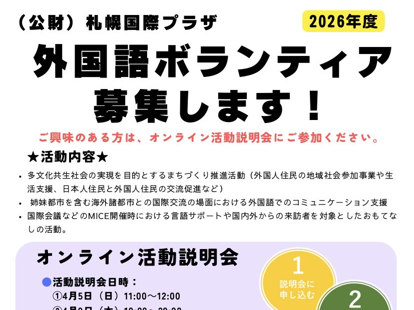 当会は公益財団法人札幌国際プラザ内に事務局を置き、国際プラザとの協力による派遣活動と外国語ボランティアネットワーク独自の自主活動を行うボランティアグループです。 What's New (公財)札幌国際プラザ外国語ボランティアを募集します 札幌国際プラザ「ひなまつり」Doll Festival (2026.2.28) ボランティア功労者に対する厚生労働大臣表彰を受賞しました かんじきツアー Japanese Snowshoe Tour (2026.1.31) [報告] 第10回SKYオープンセミナー地域版 (2025. 11. 29) [報告] 留学生のための地域文化体験~ 茶道教室 ~ [Report] Japanese Culture Experience Program for International Students - Tea Ceremony Class – (2025. 10. 26) View All ★ Facebook twitter